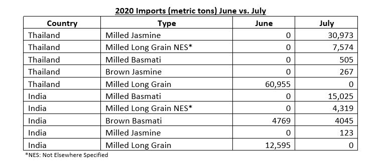 經過美國稻米成功的請願後,7月1日,美國國際貿易委員會(ITC)對精製茉莉香米、糙茉莉香米、精製印度香米實施了新的統一關稅表代碼。本月,第一批使用新關稅代碼的7月稻米進出口數據公佈。